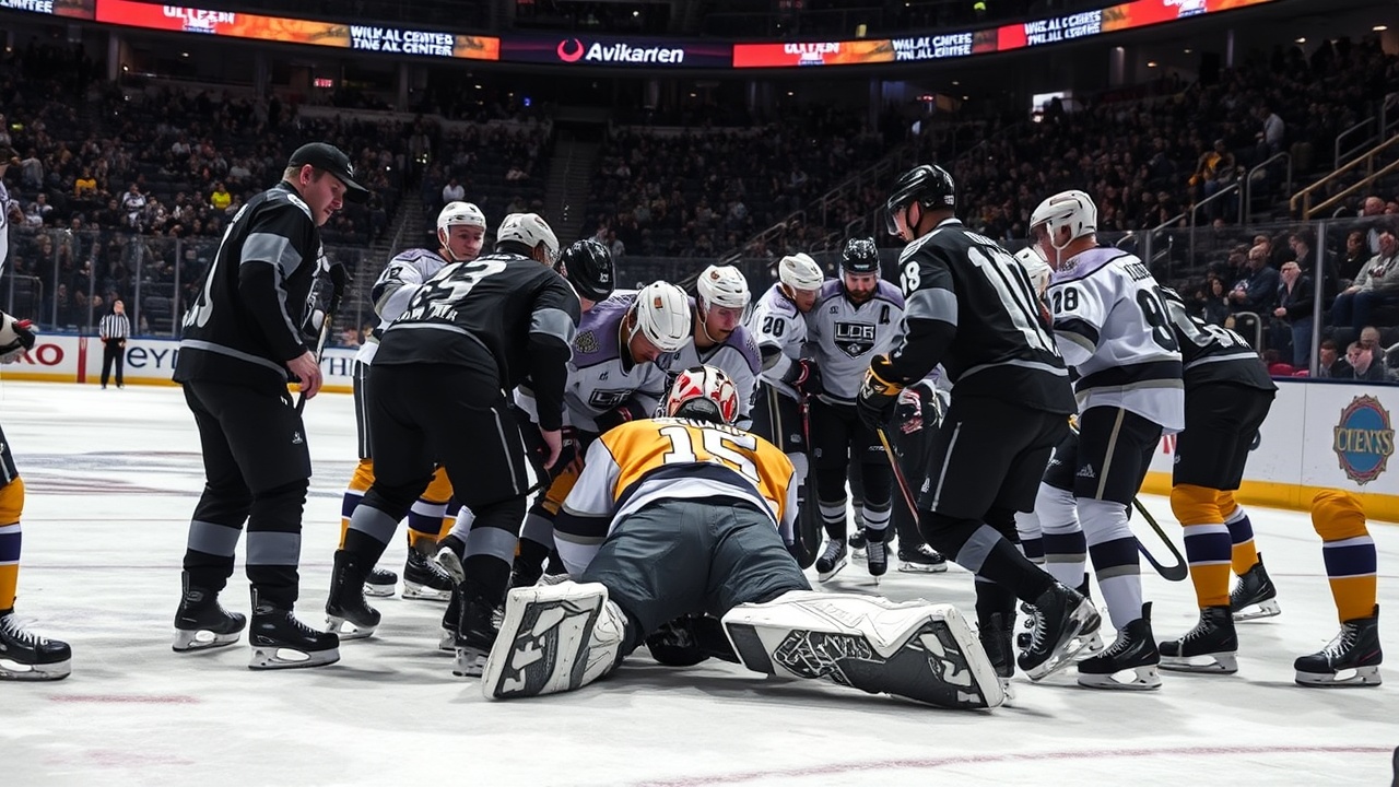 Aunque la colisión no parecía ser fuerte, Kuemper patinó con precaución durante la siguiente detención antes de dirigirse al túnel hacia el vestuario de los Kings con 38.8 segundos restantes en el período. El suplente Anton Forsberg lo reemplazó en la portería.