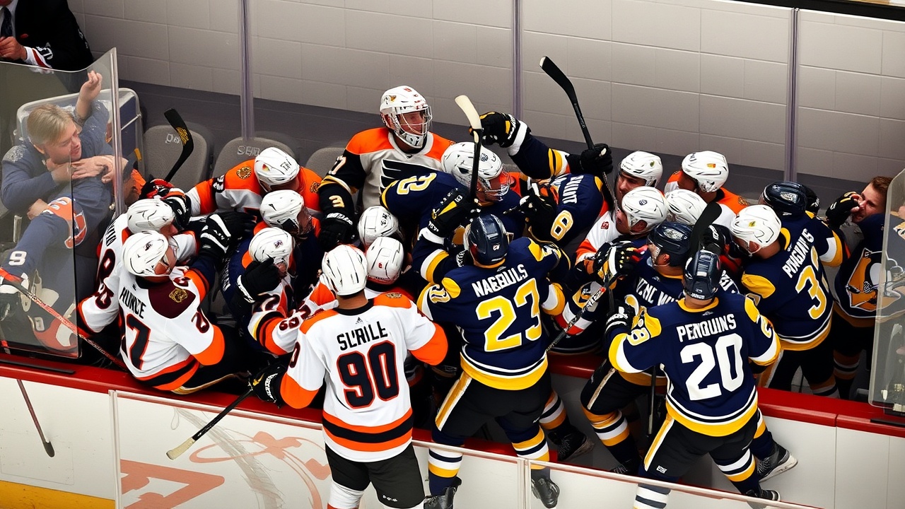 Los Flyers lideraban la serie 2-0 tras ganar ambos juegos en Pittsburgh. Esta fue la segunda noche consecutiva con un área de penalización abarrotada en los playoffs, ya que Montreal y Tampa Bay también tuvieron a cinco jugadores expulsados al mismo tiempo tras una pelea similar en el Juego 2 de Canadiens-Lightning el martes.