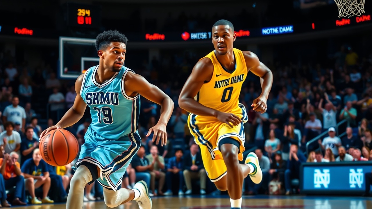 SMU comenzó el juego con una racha de 21-11, pero Notre Dame logró empatar 34-34 con unos tres minutos por jugar en la primera mitad. Miller anotó los últimos seis puntos de la primera parte, dándole a los Mustangs una ventaja de 43-37 al descanso.